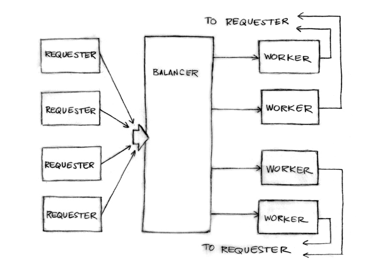 The load balancer needs a pool of workers and a single channel to which requesters can report task completion.