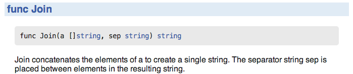 func Join(elem []string, sep string) string {The godoc tool extracts such comments and presents them on the web: